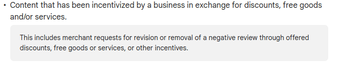 Sayangnya cara ini tidak dapat dilakukan pada Google Review, karena berdasarkan policy, suatu bisnis dilarang meminta review dengan menjanjikan imbalan.