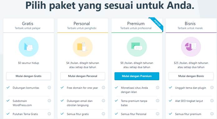 - Menggunakan domain dengan extension wordpress.com (contoh : bisnisanda.wordpress.com)